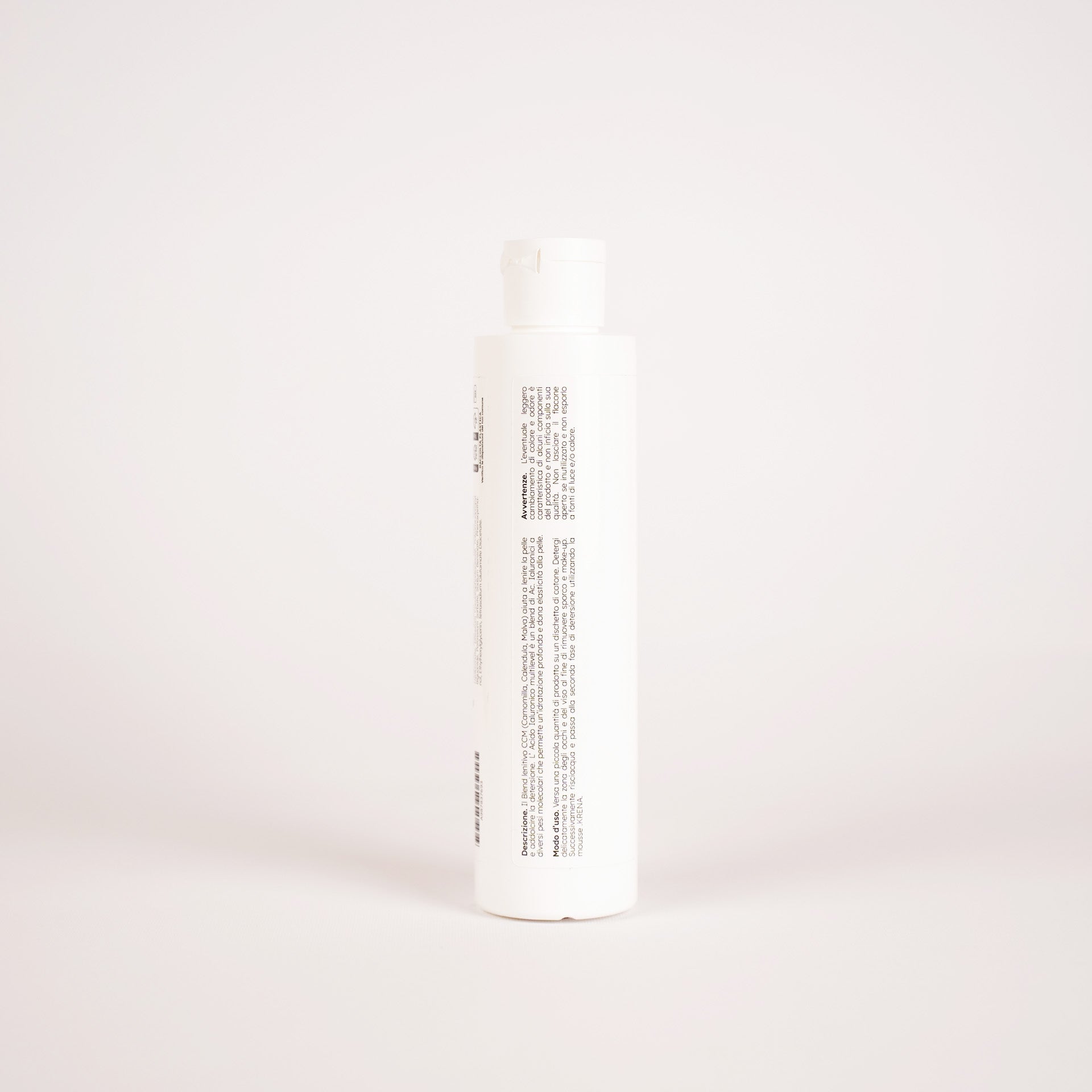 Acqua micellare arricchita con Blend lenitivo CCM (Camomilla, Calendula, Malva) che aiuta a lenire la pelle e addolcire la detersione.